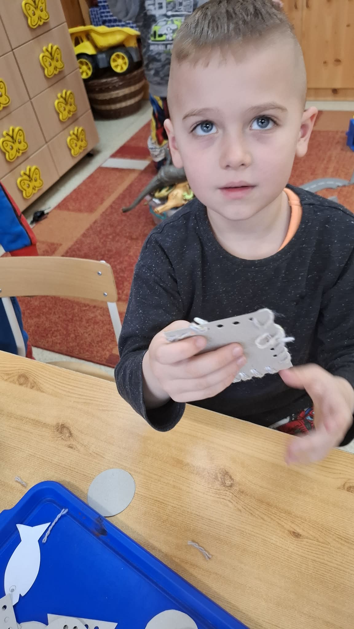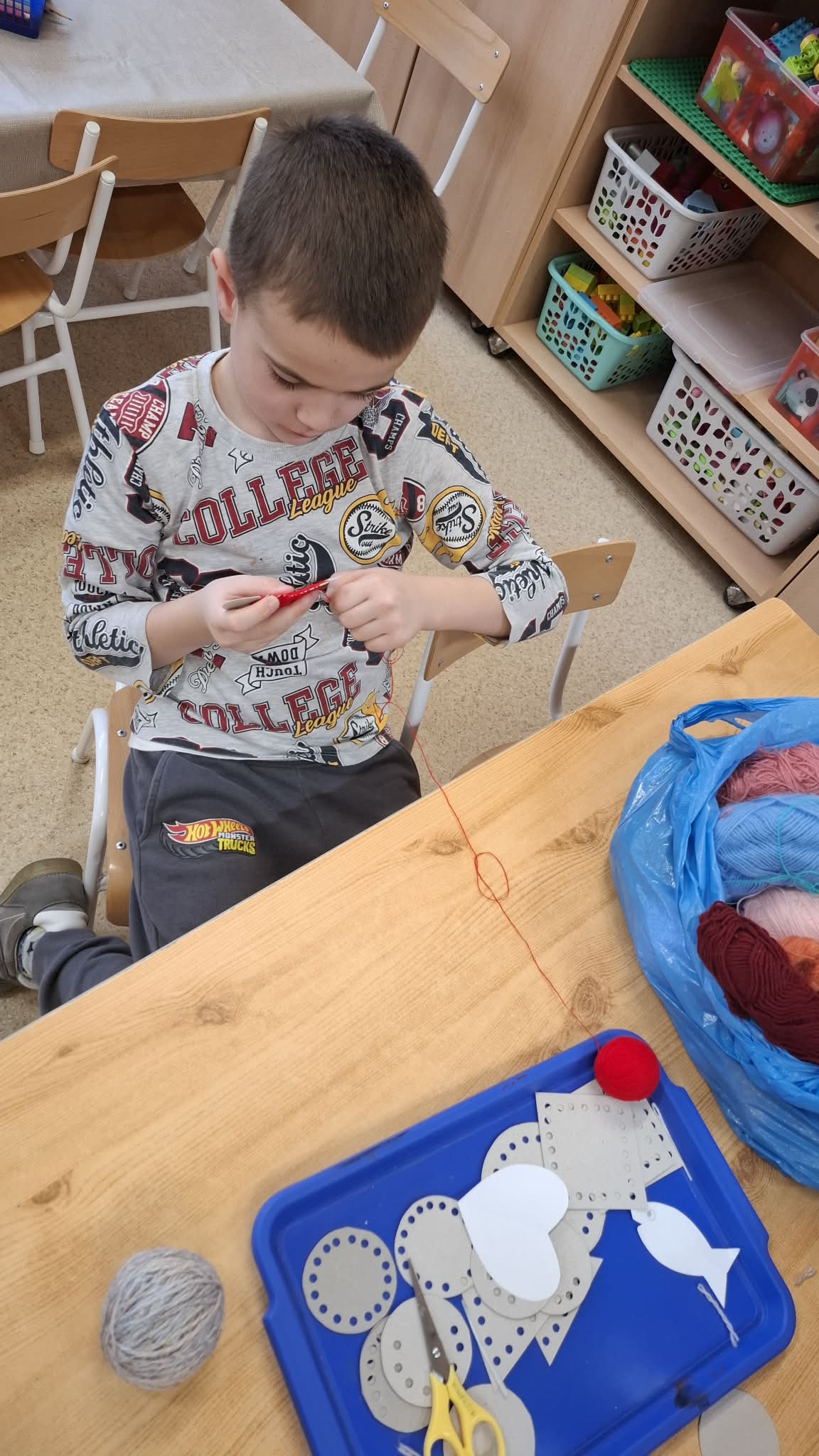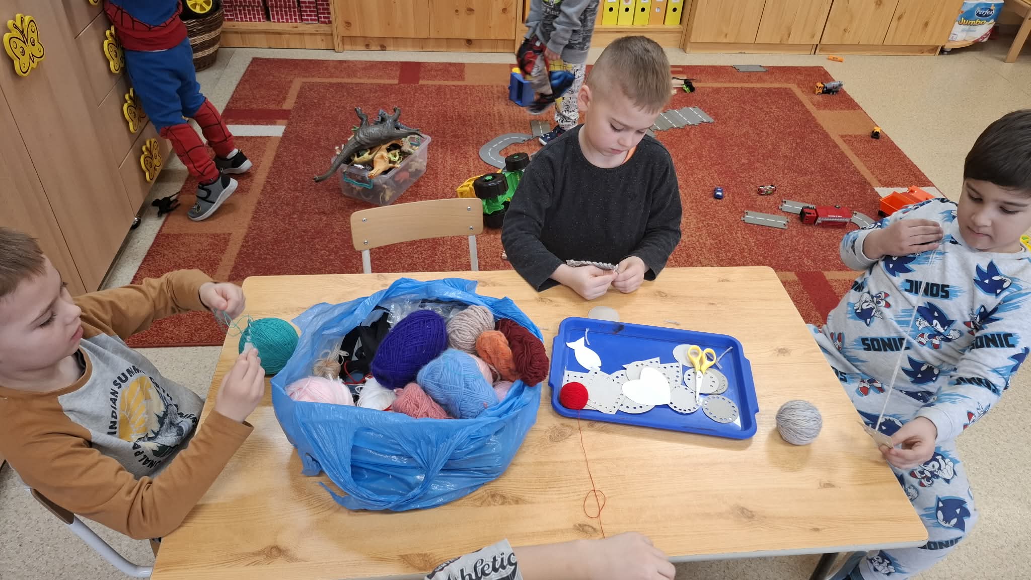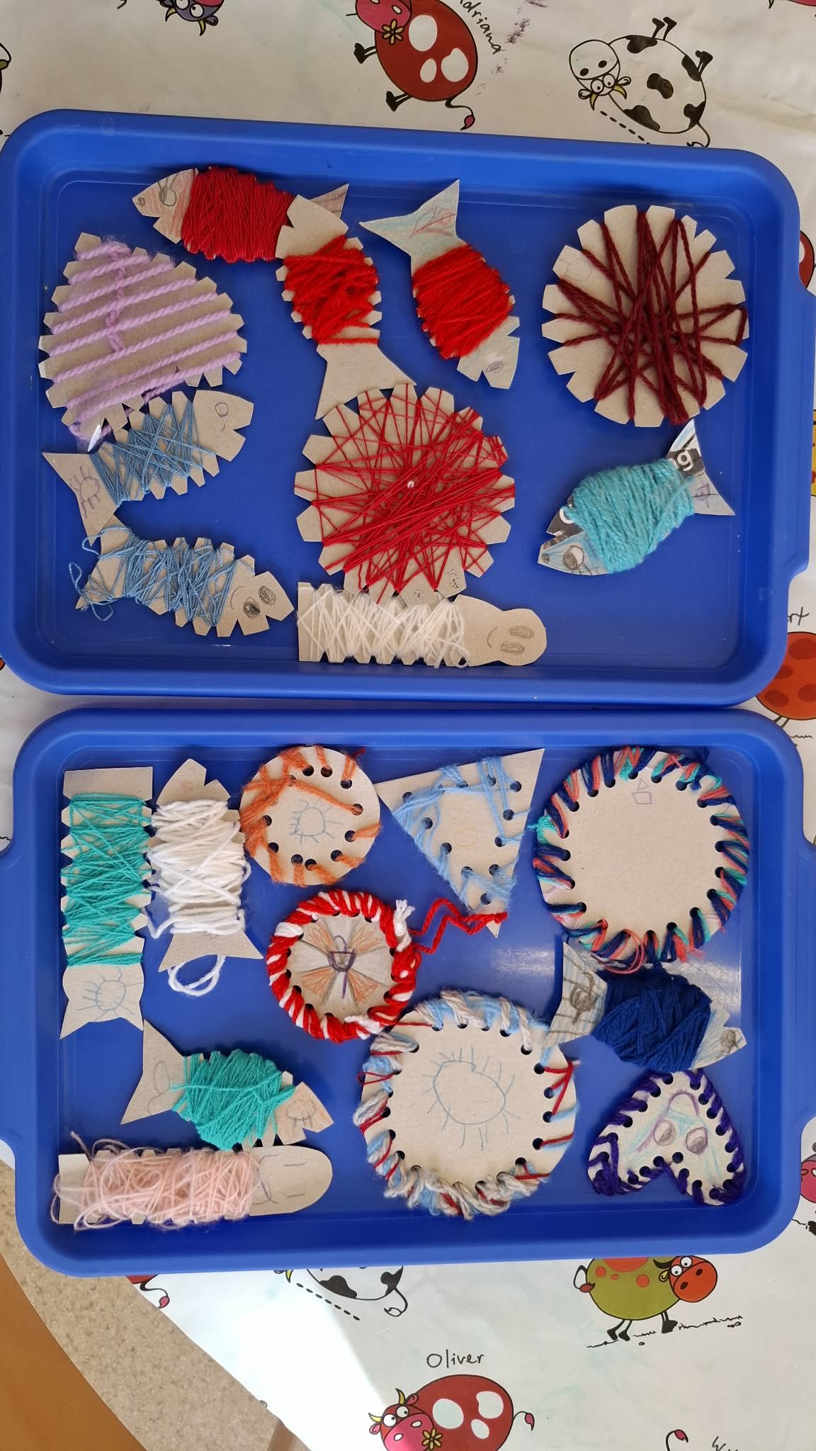 Ez a rövid hónap jó lehetőséget adott arra, hogy ismerkedjünk a varrással, a fonalakkal. A gyermekek igen nyitottak voltak a témával kapcsolatban. Örömmel ültek az asztalhoz, és kis kezükbe véve a műanyagtűket, öltögettek. Napokon keresztül folyt a munka, s közben sok mindent megtanultunk: puha, hosszú, vastag, színek, alakzatok. Okosodtak, ügyesedtek, és büszkék voltak az eredményre!