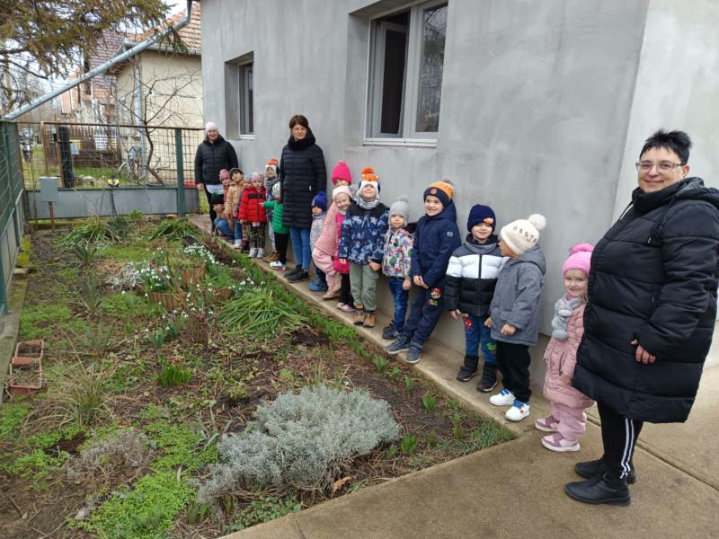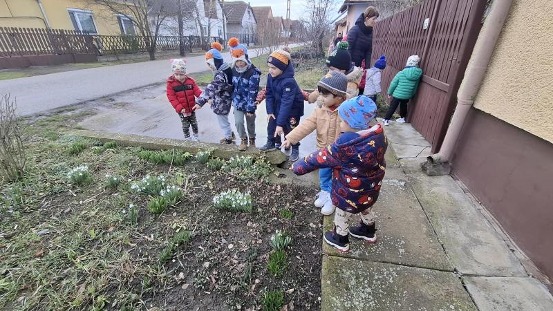 Élményszerző séták alkalmával kerestük a tavasz apró jeleit a környezetünkben, a környező kiskertekben. A hóvirágok sokasága nyílt amerre csak jártunk. Könnyű volt ezek után lerajzolni, kiszínezni, hajtogatni. Az óvoda folyosóját szépen díszítette a tavasz első virága a gyermekek keze munkáját követően.