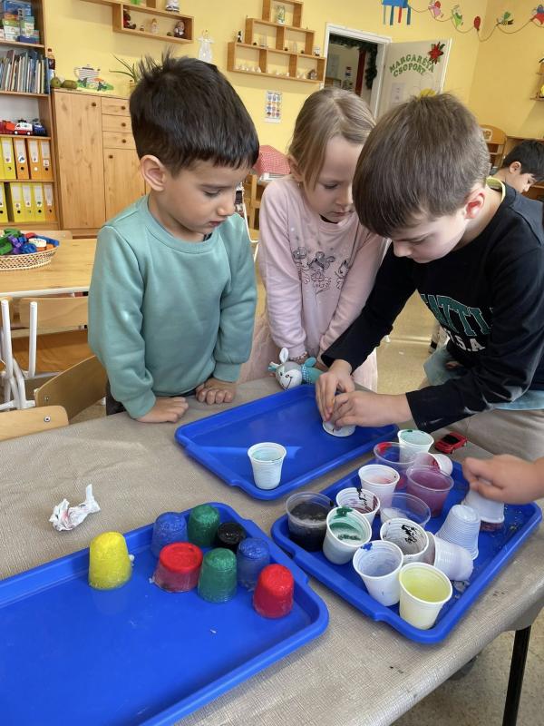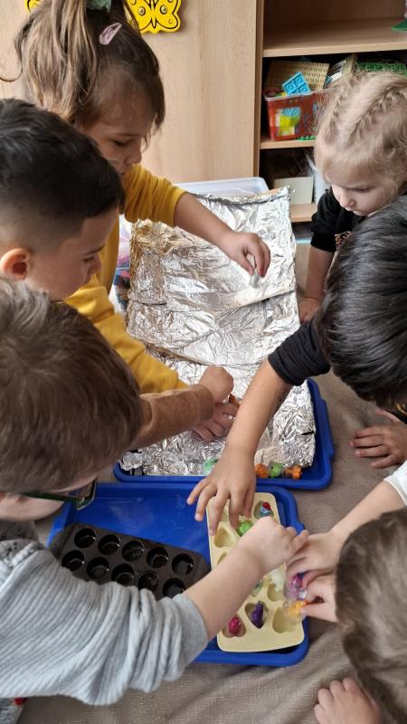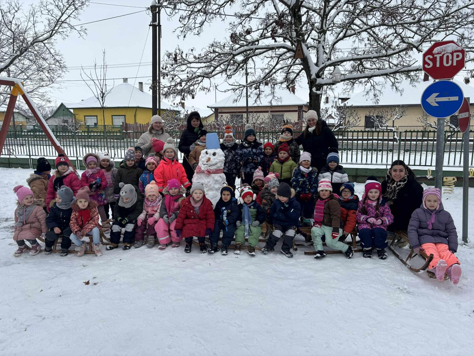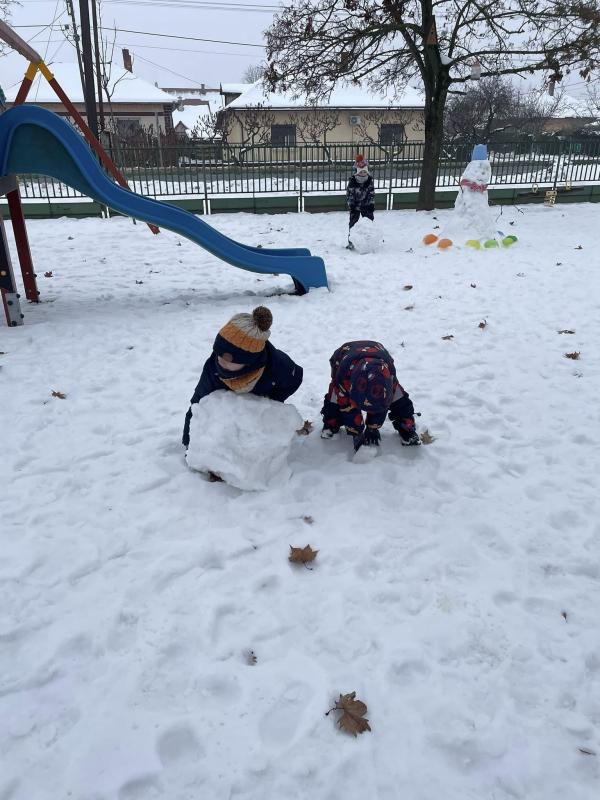 Amit télen mindig hiányolunk év elején- meg úgy egyáltalán- az a hó! De most aztán egy szavunk sem lehetett, mert jó sokat kaptunk belőle. Éltünk is a lehetőséggel, nem is egyszer, hanem sokszor. Felkerekedtünk, felvettünk mindenféle meleg ruhát, csizmát és vittük a szánkónkat, a város szélére. Hófehér táj terült elénk, lankás domboldallal. Fülig ért a szánk, és senki nem fázott, mert mindenki el volt foglalva valamivel. Lehetett hóembert építeni, hógolyózni, szánkózni. Vicces pillanatok, nagy kacajok, jó hangulat jellemezte kirándulásunk minden mozzanatát. Persze a mindennapokban az udvaron is építettünk hóembert, amit gyönyörű, színes jéggömbök vettek körül, egy kísérlet eredményeként. Ebben a hónapban sok kísérlet zajlott a jéggel, ilyen volt a jéggel festés is.