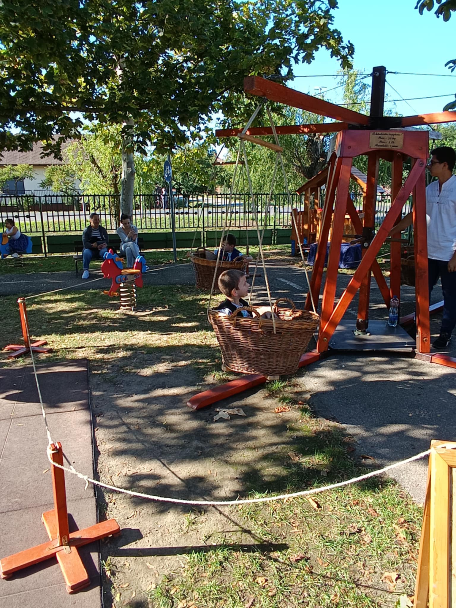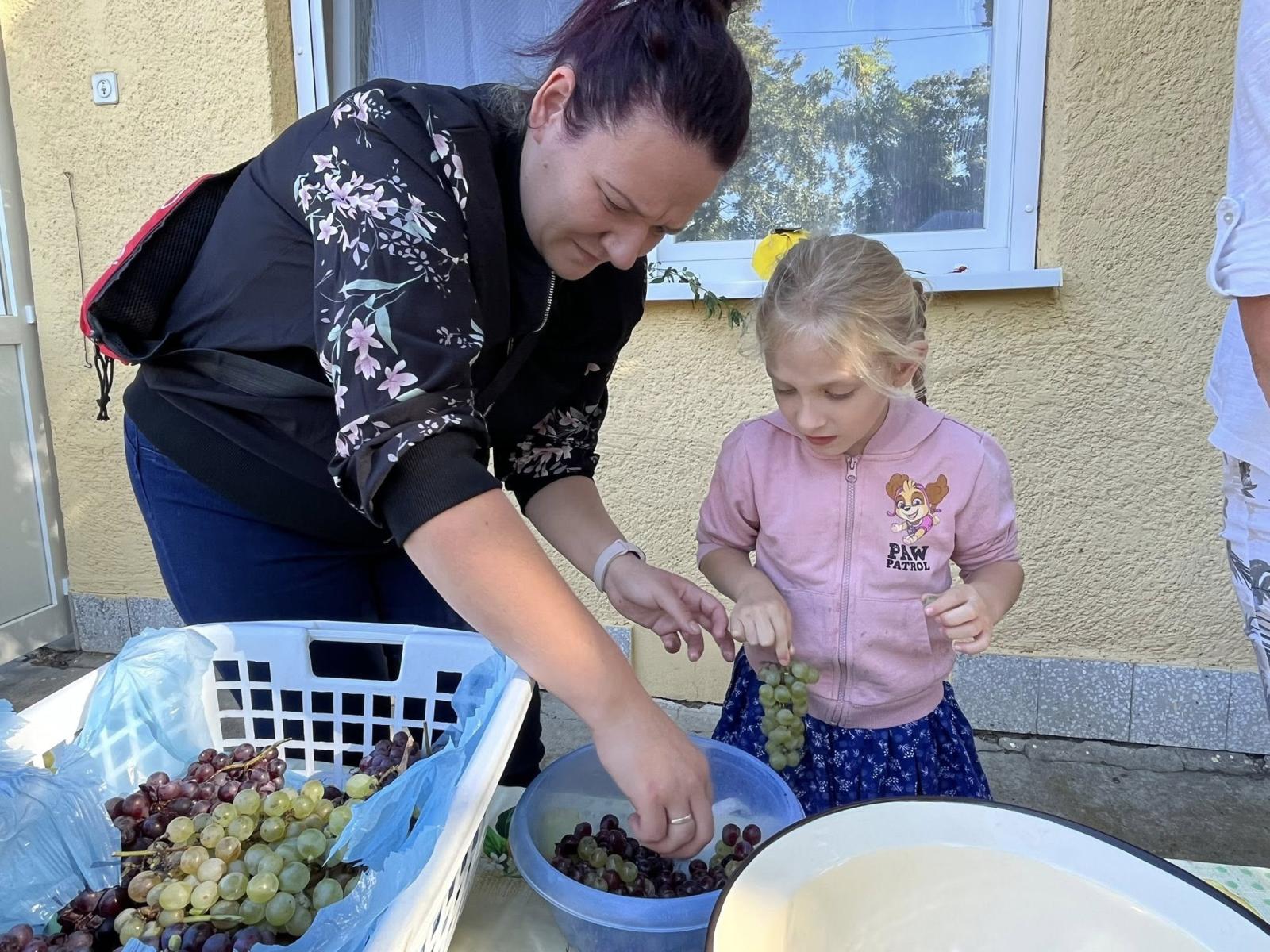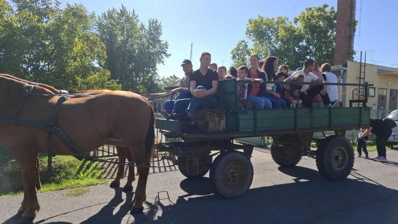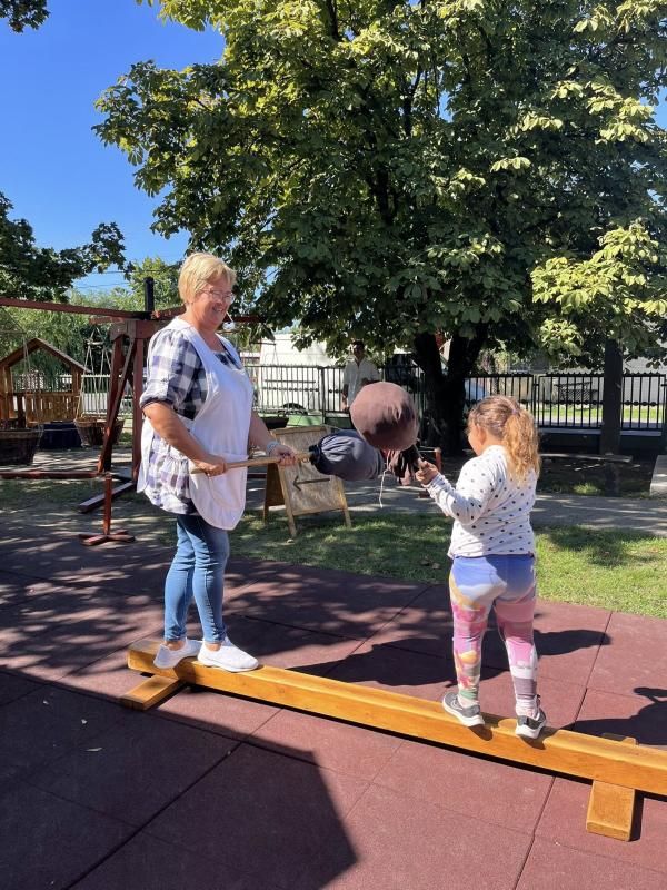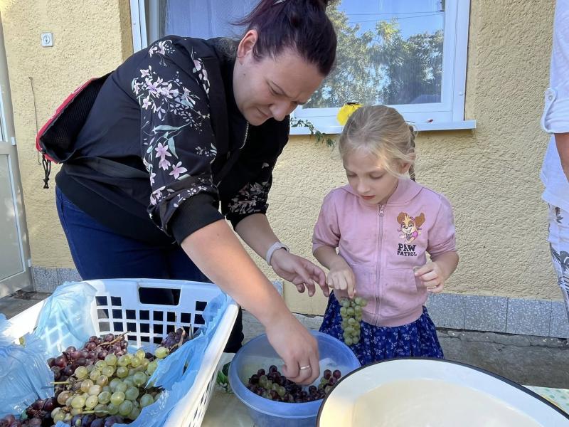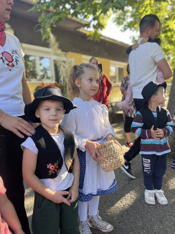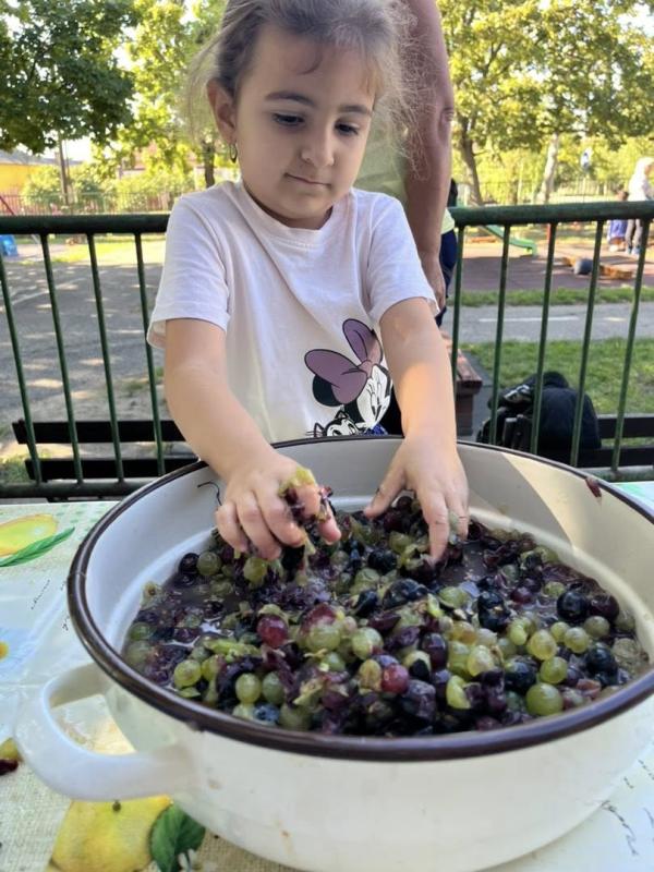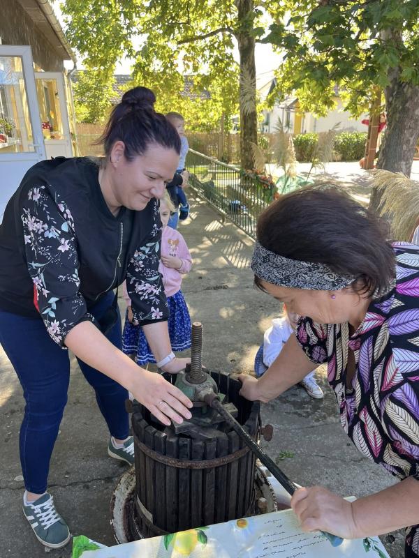 Első óvodai nyílt programunk a Szüreti mulatság volt, ahová a szülőket is vártuk közös játékra és megvendégelésre. A szomszédos településről, Túrkevéről érkeztek hozzánk népi játékokat hozva magukkal, a Mosolyudvar Népi Játszótér. A gyermekek beleülhettek a kosaras körhintába, de volt lengőteke, patkódobás, egyensúlyozó gerenda és sok egyéb játéklehetőség. A vidéki játszótér játékait felnőtt és gyermek egyaránt kipróbálhatta. Köszönjük Szűcs Gábornak a lovaskocsikázás biztosította lehetőséget. A szülői felajánlásokat köszönjük: lekvár, őszi gyümölcs, szörp, mindenféle finomságok. A szőlőből szemezgetés után préseltünk mustot, amit jóízűen kóstolgattak a gyermekek. A tízóraira készült zsíroskenyér, lilahagymával igen ízletes volt. A gyümölcstálból sokat is falatoztunk, és igaz, hogy a nutellás gofri nem igazán illett a sorba, de a gyermekek bármikor szívesen fogyasztják. A délelőtti program szülőknek is annyira tetszett, mint a gyermekeknek.