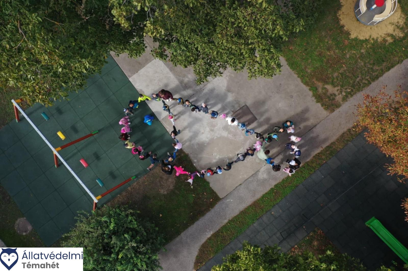 Az Állatvédelmi Témahét egyik kedves feladata során a hónap elején az udvarunkon egy halacska formát jelenítettek meg a gyermekek, amelyről drón fotó készült.