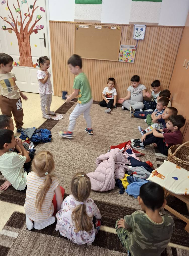 A gyönyörű, színes, őszies időben sokat beszélgettünk az őszi időjárásról és az őszi öltözködésről. A hűvös reggelek miatt már előkerültek a sapkák, sálak, átmeneti kabátok, azonban a napsütéses időben még kellemesen lehetett játszani az óvoda udvarán.
