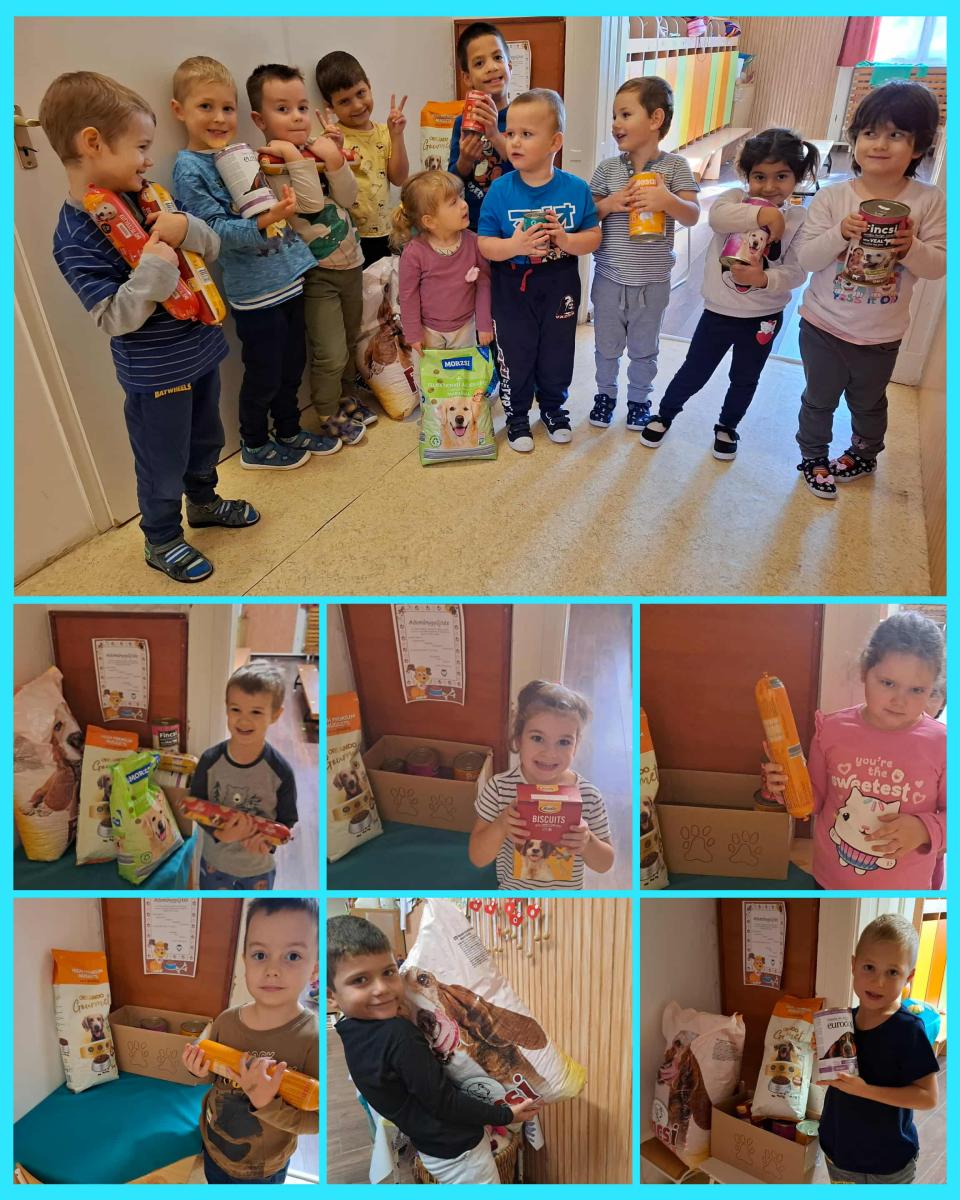 Sokat beszéltünk a gyermekekkel arról, hogyan tudjuk védelmezni az állatokat, mi a felelős állattartás, illetve hogyan tudunk segíteni a hontalan állatoknak. Óvodánk idén is kezdeményezte, az elmúlt évekhez hasonlóan, hogy dolgozói és a szülők gyermekeikkel együtt támogassák a kisújszállási Kutyabarát és Állatvédő Civil Egyesület gondozásában lévő állatokat. A felhívásra nagyon sok kutyakonzerv, kutyatáp, kutyaeledel érkezett. A felajánlásokat, támogatásokat ezúton is tisztelettel köszönjük a szülőknek. Az összegyűjtött adományokat a gyerekekkel együtt át is adtuk az Egyesületnek.