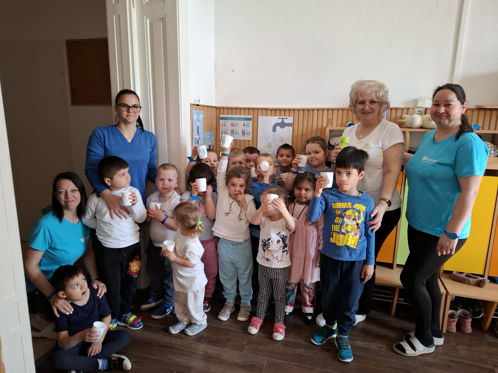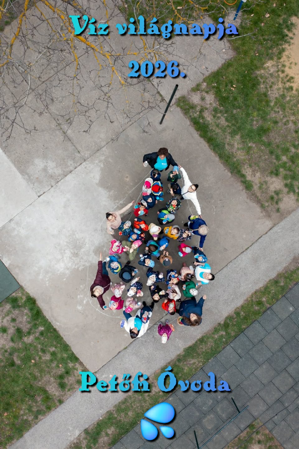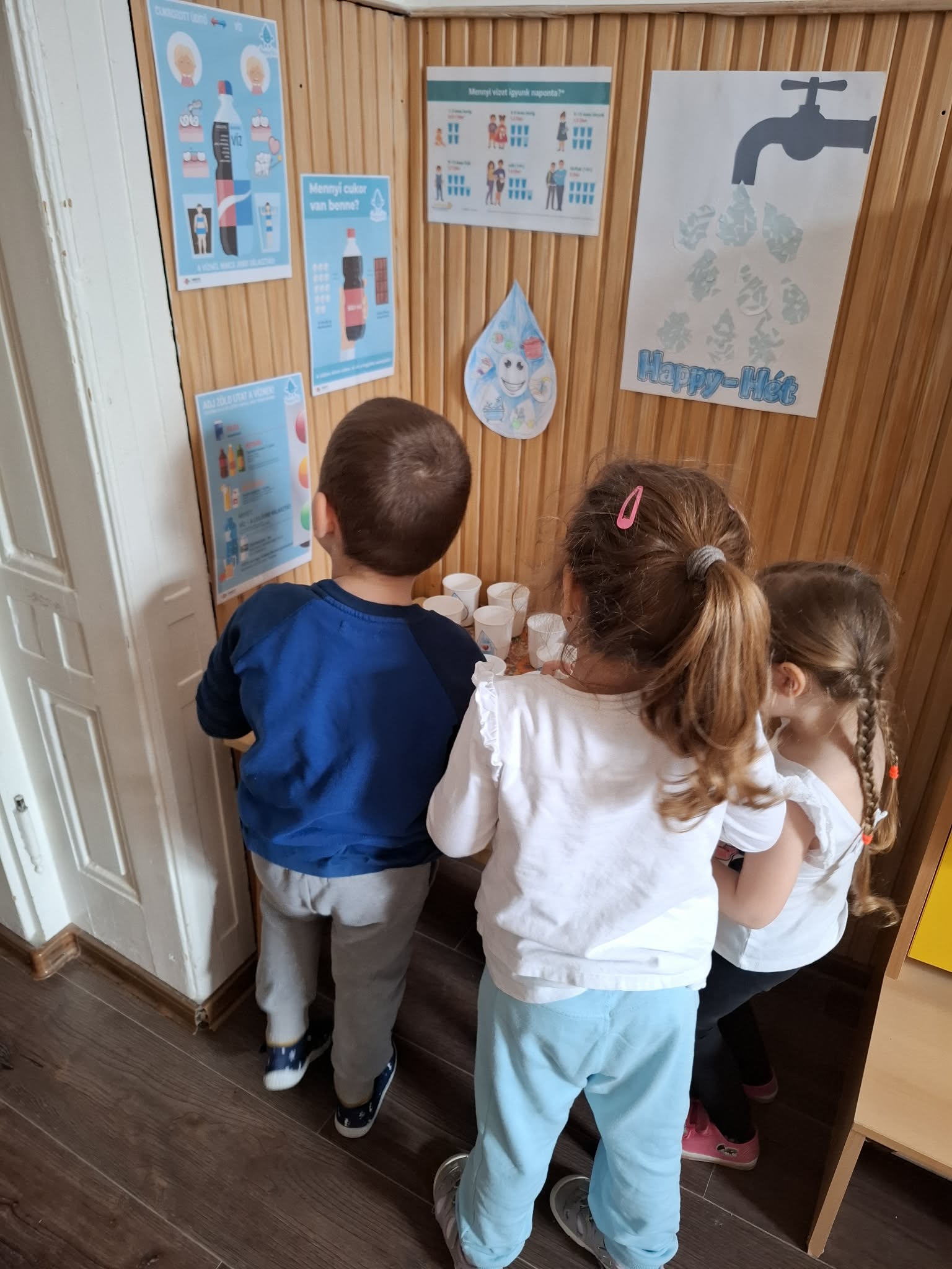 Idén második alkalommal csatlakozott óvodánk a Happy-héthez, az ország vízfogyasztást népszerűsítő kampányához. Március harmadik hetén változatos tevékenységeken keresztül hívtuk fel a gyermekek és a szülők figyelmét a víz egészségvédő szerepére. Előrekerültek a Happy-hét figyelemfelhívó plakátjai. Megfigyeltük és ki is számoltuk, melyik üdítőben és finomságban mennyi cukor van. Vízcsepp karkötőt készítettünk, Happy-hetes színezőket színeztünk és feladatlapokat oldottunk meg. A hét utolsó napján kék és fehér pólóba öltöztünk és a tematikus hetünket közös vízcsepp fotóval zártuk, amely drón kamerával készült a gyermekek nagy örömére.