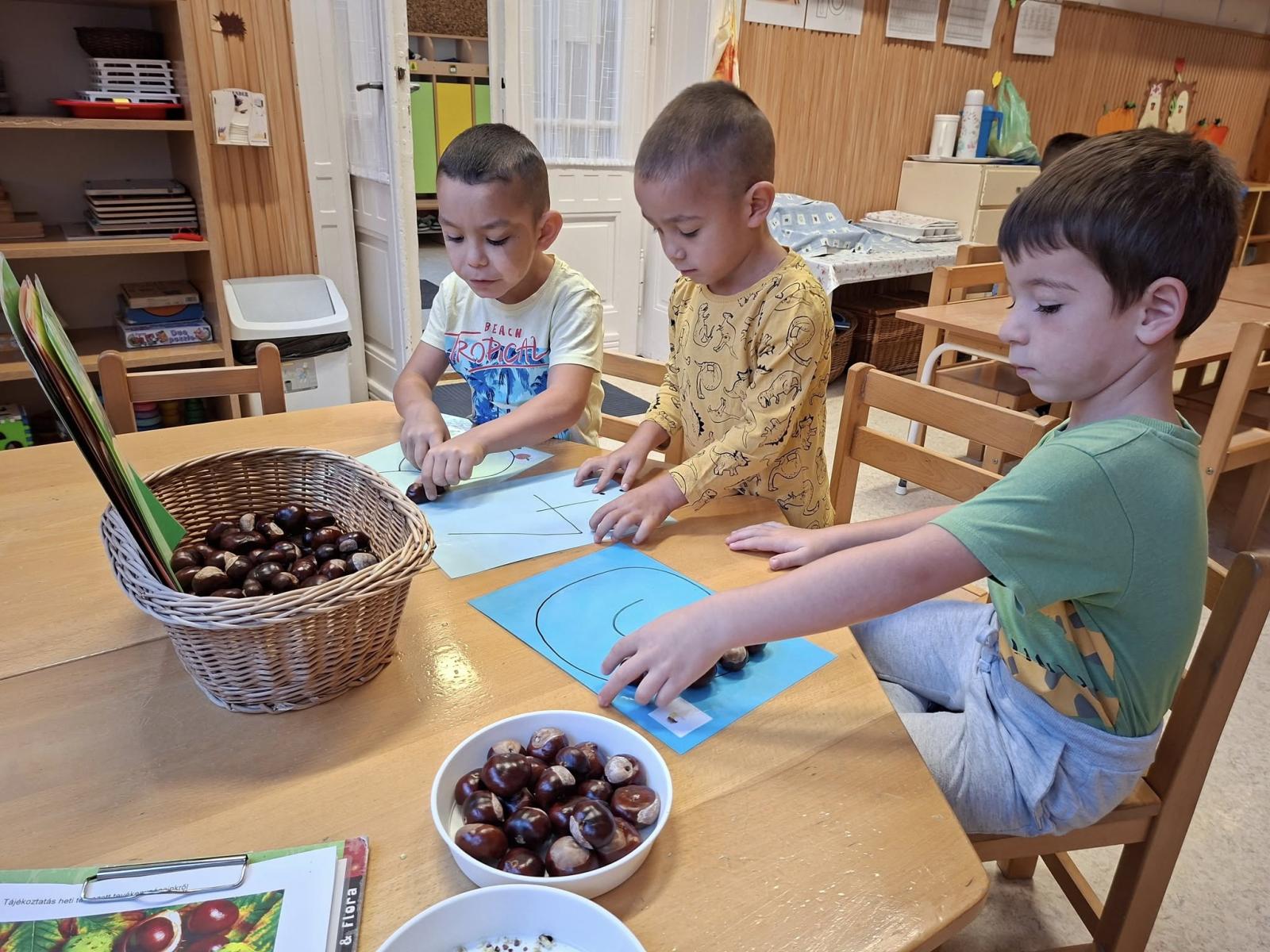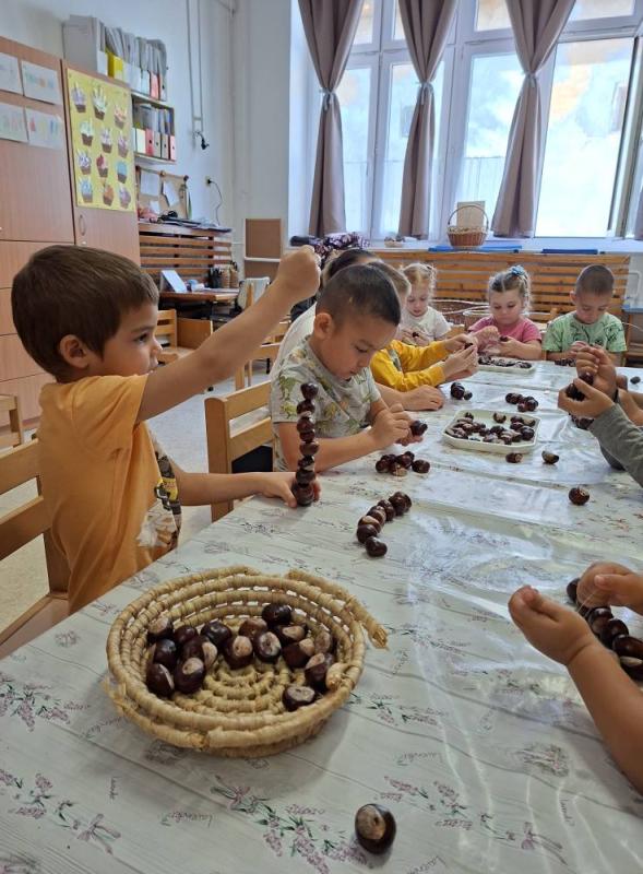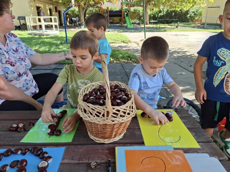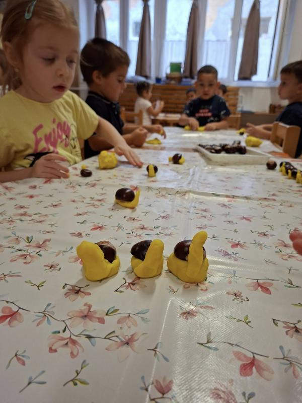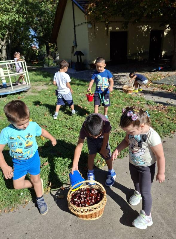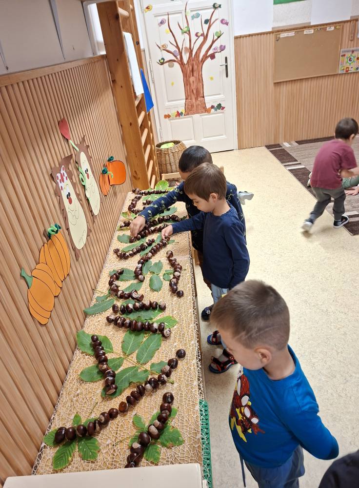 Idén csodálatos gesztenye-, és diótermés ajándékozott meg bennünket. A gyerekek nagyon megörültek a lehullott gesztenyéknek és dióknak az óvoda udvarán. Sok-sok vödörnyi termést gyűjtöttek, amellyel szívesen játszottak. Az összegyűjtött gesztenyékkel számoltak, formákat rakosgattak, gyurmáztak és gurigáztak a gyerekek. A kifúrt gesztenyékből őszi ajtódíszt és gesztenyekukac-farmot is készítettek óvodásaink.