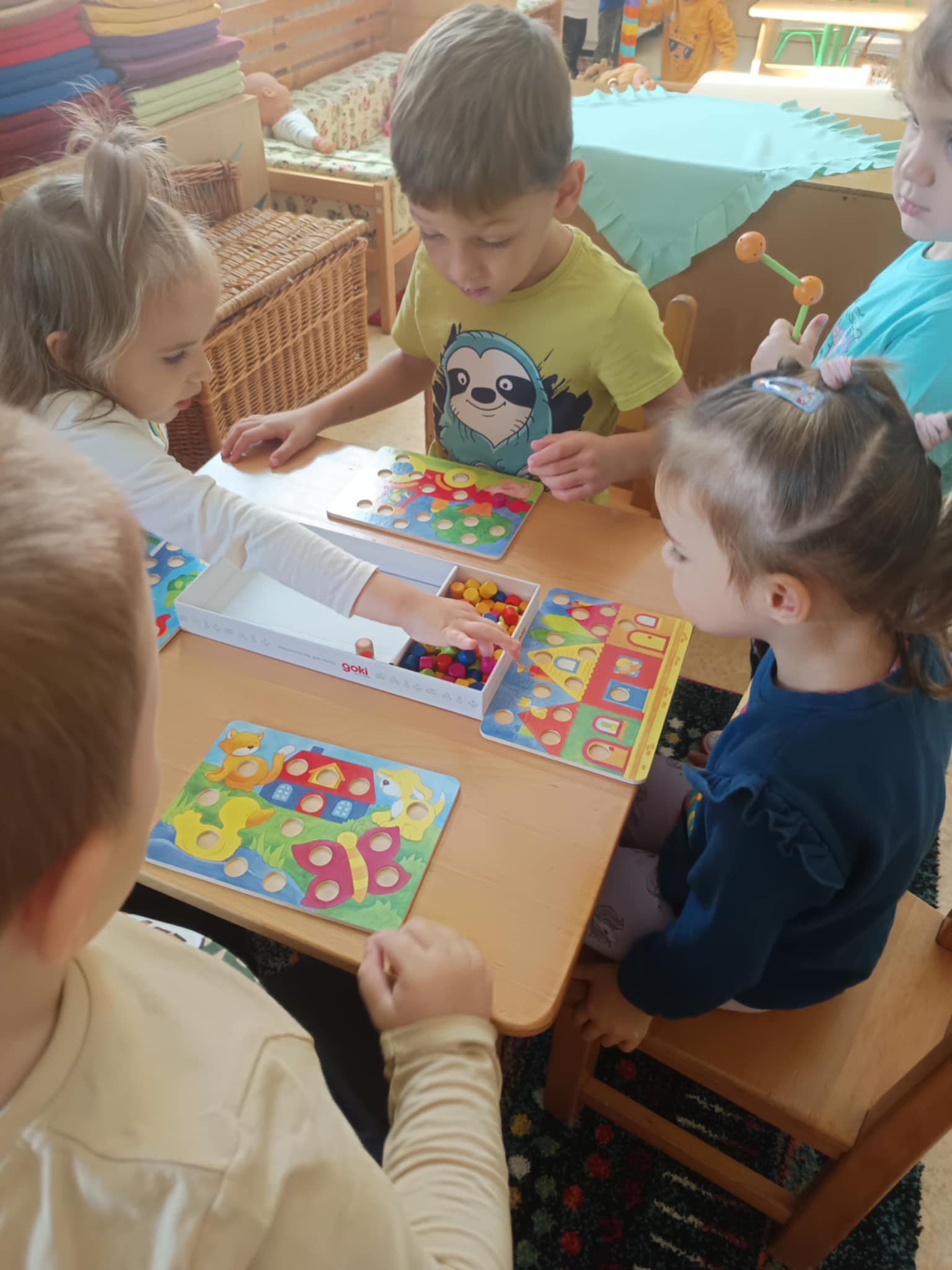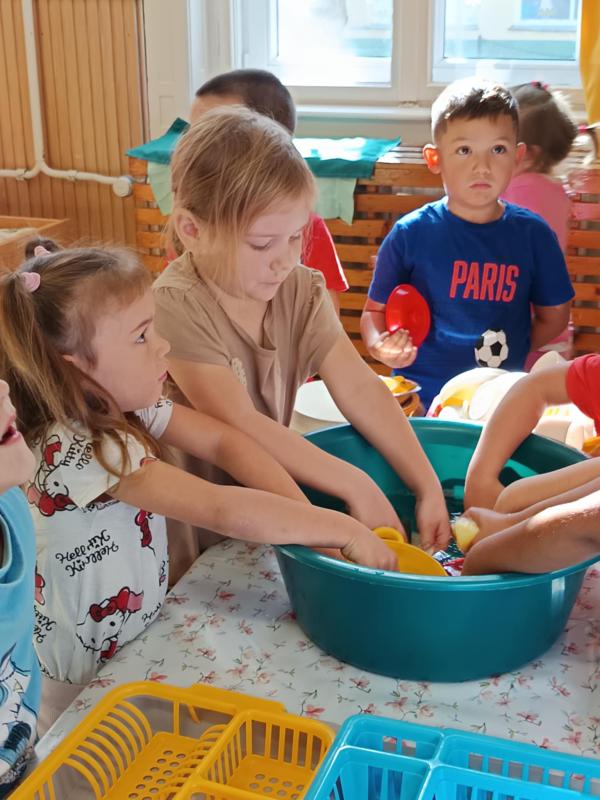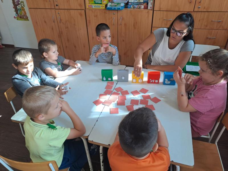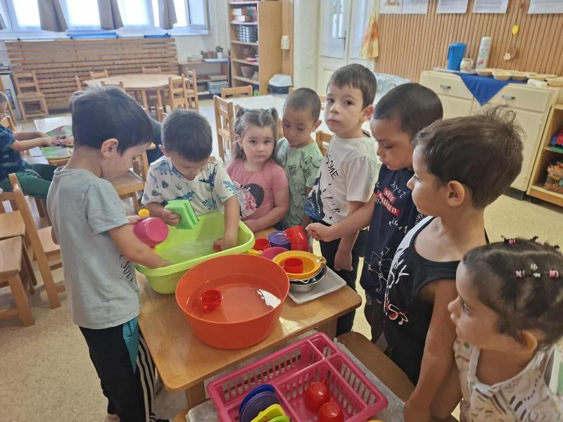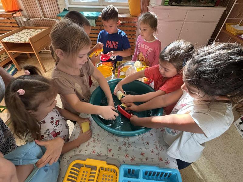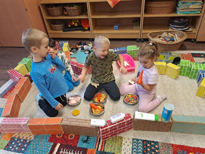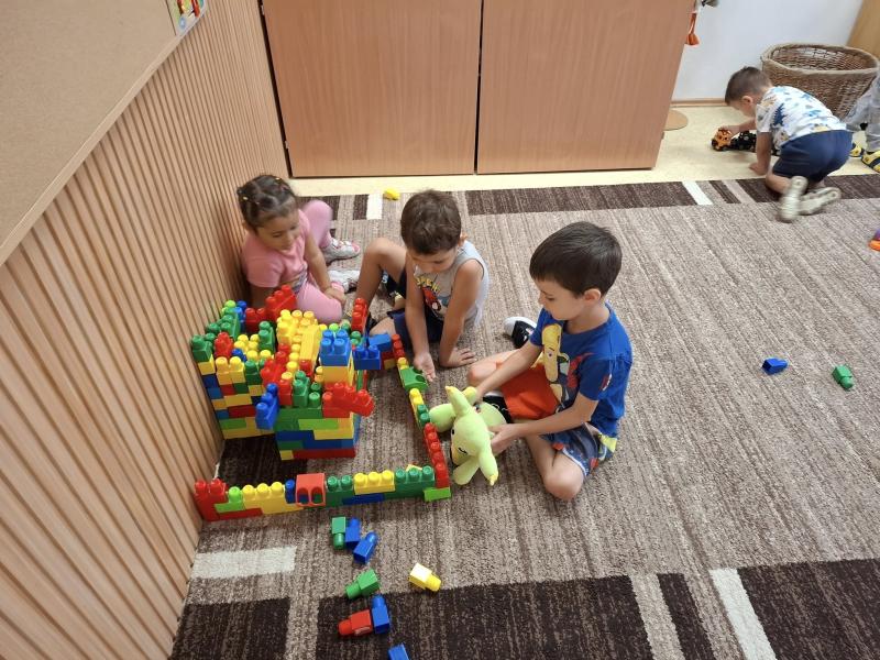 Esősebb időben azonban a csoportszobákban játszottunk. Előkerültek az asztali és a szőnyegi játékok, a gyermekek építettek, kisautóztak, színeztek, kirakóztak és a babakonyhában főzőcskéztek.