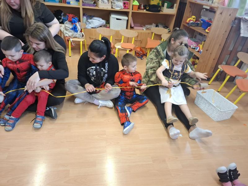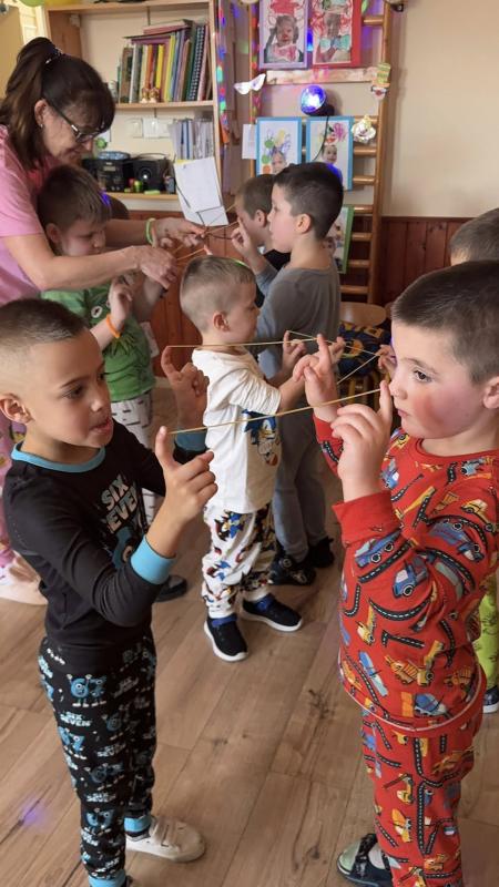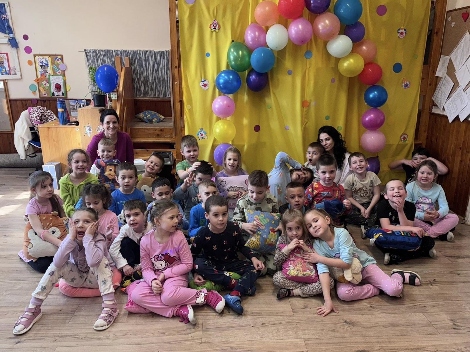 A farsangi időszak különleges élménye volt a gyerekek számára a pizsiparti és a nagy párnacsata. Az ovisok hatalmas lelkesedéssel vetették bele magukat a „csatába”, és még a legkisebbek is hősiesen küzdöttek, sok-sok nevetéssel.