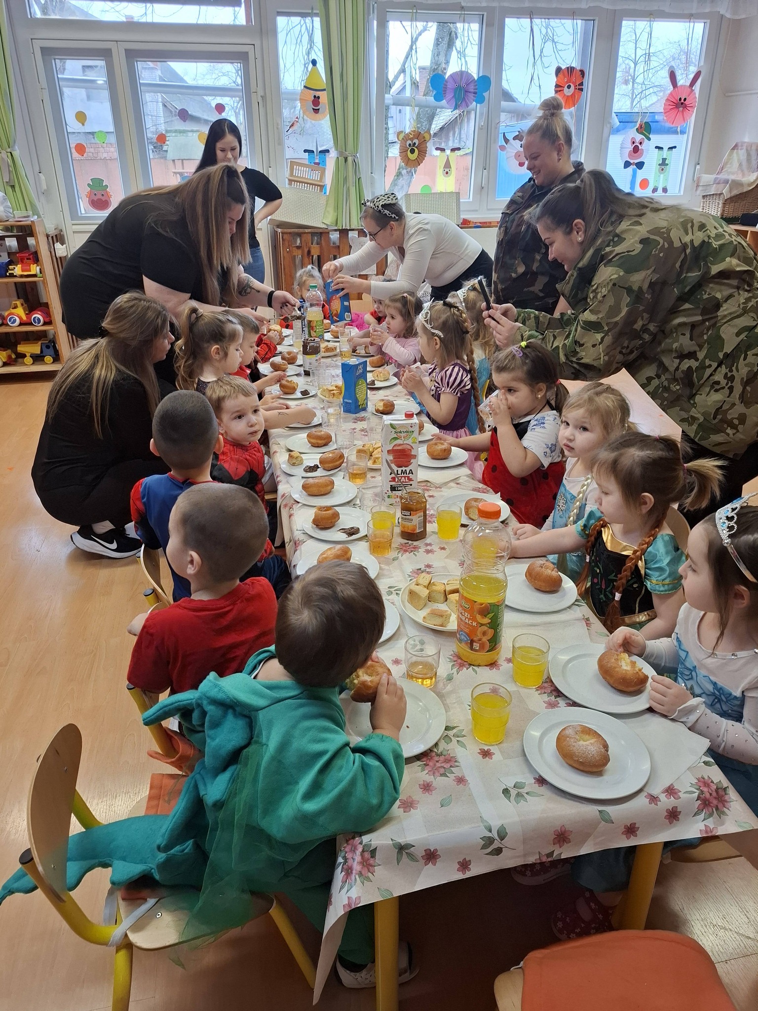 A farsangi készülődés természetesen az óvodát is vidám hangulatba öltöztette. A gyerekek és a szülők együtt készültek az ünnepre, és a közös játék öröme mindenhol jelen volt. A farsangi hét jelmezes napját a szülőkkel együtt tölthettük el, mindenki legnagyobb örömére. A csoportszobákat vidám gyermekarcok, jelmezek és nevetés töltötte meg. A heti mulatságból nem maradhatott ki a finom farsangi fánk sem, amely igazán ünnepi hangulatot varázsolt.
